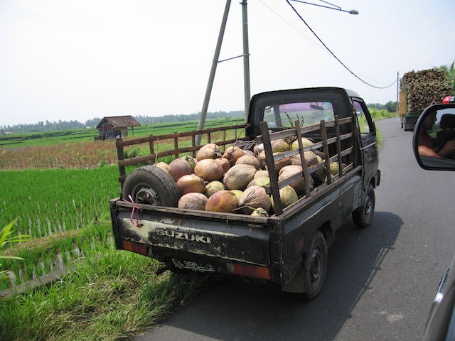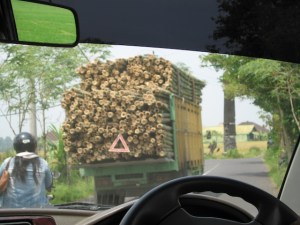 Here are a few shots of our driver passing a truck carrying coconuts, and then passing the bamboo truck…Sometimes, I wish I had my car seat like back home!