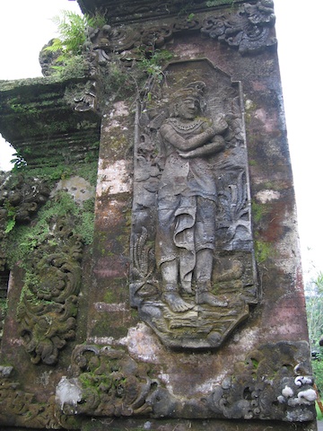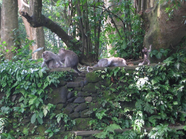 We head out and about an hour later, we arrive at our first stop: Ubud. We weren’t originally planning to go there, but we were giving someone a ride. The first thing we see when we get to Ubud is the Sacred Monkey Forest (http://www.monkeyforestubud.com/). I’d love to go in and play with the monkeys, but we just drive by and see some monkeys relaxing in the shade on the side wall. This is enough monkey watching for mom…