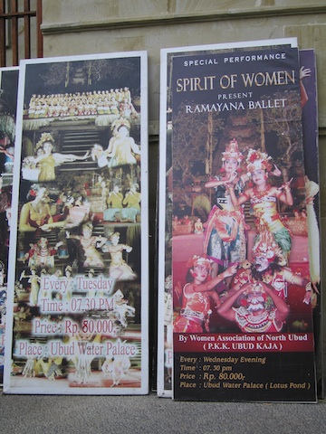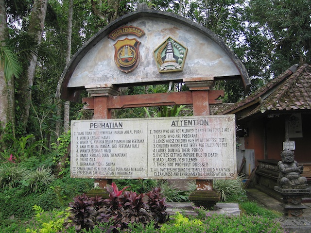 At the entrance of the temple, there is a sign advertising the Kacek-Kacek (Traditional Balinese dance) show that will take place tonight at 7:30pm. Be forwarned, that according to the sign, you may think that the show only takes place once a week…But fear not, when we went out back, we saw a slew of signs advertising the same show, one for every night of the week. So don’t worry, if you already have plans and you think you will miss the famous Kacek-Kacek, you’ll have the chance another night of the week.
