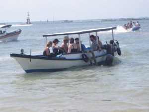 Gutsy people getting onto boat for a snorkeling expedition at Nusa Dua