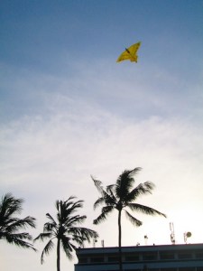 Given the great number of boat rides that initiate from this beach, there are alot of people and the water is not so clean – not great conditions for swimming 😦 Also, as you get closer to the shore, the sand is covered with big pieces of broken seashells, and just accumulated debris which makes it hard to get into the water without having your feet poked every which way…Alot of ‘Oooohs-Aaaahs-Ouch’ as we slowly tried to make our way to the water. We still had a nice afternoon playing in the sand, and we finished the day by watching my second cousin learn to fly a kite.