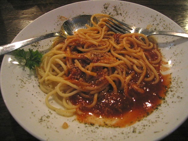 As mom brought me over to wash my hands (note that most restos in Bali have convenient little sinks that are placed by the dining area so you can wash your hands pre and post meal time – perhaps this is geared for motorbike-riding clientele like us), dad order me a spaghetti bolognese from the Kids menu and a side of steamed veggies (extra soft).
